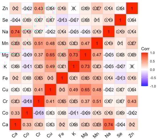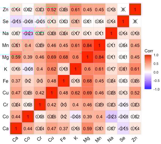 The inter-element correlations for the AUD and control groups are expressed as the Spearman rank-order correlation coefficient. The choice of Spearman’s rank correlation coefficient was dictated by the fact that most of the elements were characterized by strong asymmetry, and the relationships between concentrations were not always linear. The coefficient values are summarized in Figures for the AUD and control groups respectively (Figure 2 and Figure 3). For the AUD group, we obtained mainly weak, positive correlations with the Spearman correlation coefficient (Spearman’s r) greater than 0.5 only for a few cases. Positive correlations of greater importance concern the following correlations Ca/Mg; Cu/K, Mg, Zn; Mg/Fe; K/Mg, Mn, Zn; Mg/Mn. It can be seen that there are almost no negative correlations. In the control group, significant positive correlations concern the following pairs of elements: Cr/Mn; Cu/Mg; K/Mg; Na/Ca. The others are on a level less than 0.5.