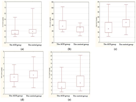 Box and whisker plots considering the median values constructed for statistically significant differences in elements content in the liver tissue of cases (AUD) in comparison to the controls: Co (a), Fe (b), Mg (c), Mn (d), Cu (e). The Mann–Whitney U test parameters are collected in Table 4.