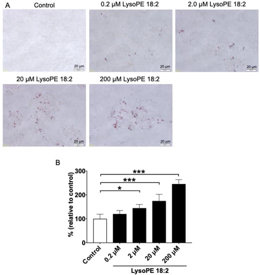 Oil Red O staining and evaluation of lipid accumulation. (A) Lipid droplets formed by C3A cells supplemented with 0.2–200 µM lysoPE 18:2 (40×). (B) Quantification of lipid accumulation, as measured by the absorbance of extracted Oil Red O dye. Absorbance in the control group was set as 100%. Results were expressed as mean ± standard deviation. n = 4. * p < 0.05, *** p < 0.001.