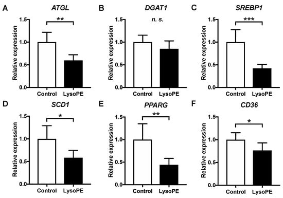 Expression of genes related to lipid droplet formation in lysoPE 18:2-supplemented and unsupplemented C3A cells. (A) ATGL; (B) DGAT1; (C) SREBP1; (D) SCD1; (E) PPARG (PPARγ); (F) CD36. The vertical axis shows the relative expression levels compared to the untreated control cells, which was set to 1.0. n = 6. Student’s t-test, * p < 0.05, ** p < 0.01, *** p < 0.001, n.s. not significant.