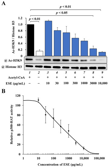 The effect of ESE on p300-HAT activity in vitro. (A) Samples were subjected to Western blotting with anti-acetyl-histone H3K9 antibodies and anti-histone H3 antibodies. Shown are quantified levels of acetylated histone H3K9 and total histone H3. Data are presented as the mean ± SEM of three individual experiments. (B) Concentration–response curve obtained by plotting acetyl-histone H3K9/histone H3 vs. common logarithm (concentrations). The IC50 value of ESE was 505 μg/mL. Quantified values of ESE are presented as the mean ± SEM of three individual experiments.