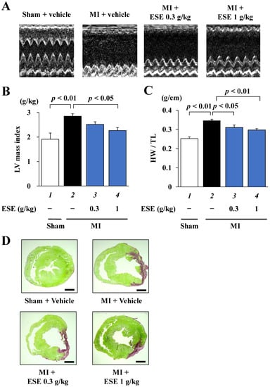 MI-induced systolic dysfunction was improved by ESE treatment in vivo. Cardiac function was measured by echocardiography at 8 weeks after treatment. (A) Representative images of echocardiography. (B) MI-induced increase in LV mass index was significantly suppressed by 1 g/kg of ESE. Data are presented as the mean ± SEM. (C) MI-induced increase in HW/TL was significantly suppressed by 1 g/kg of ESE. (D) Representative photographs of PSR-stained sections of LV myocardium from sham and MI rats. Scale bar: 2 mm.