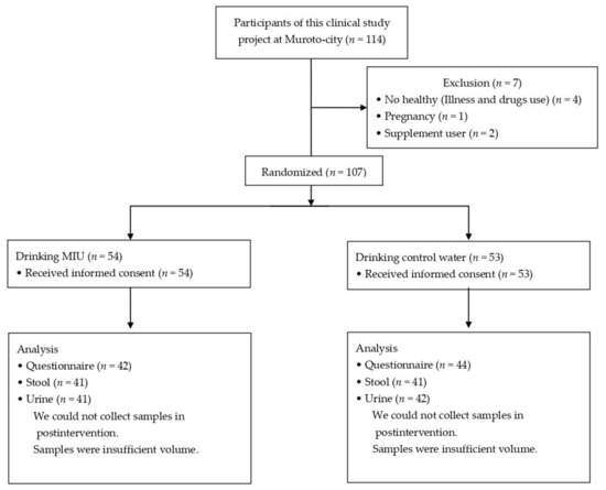 Flow diagram of this clinical study. A total 107 healthy adults were enrolled from Muroto, Kochi, Japan. Potential participants with any current illness, those using any prescription or commercial drugs or dietary supplements, and pregnant women were excluded. Participants in the experimental group consumed MIU (hardness, 88) and those in the control group consumed mineral water (hardness, 0–20).