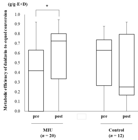 Effect of MIU or control water on the metabolic efficiency of daidzein-to-equol conversion throughout the intervention period. The metabolic efficiency of daidzein-to-equol conversion was significantly prompted in the MIU group. The top and bottom of each box indicate the 25th and 75th percentiles, and the solid line within the box is the median. Whiskers depict the minimum and maximum values. pre, preintervention; post, postintervention, * p < 0.1.