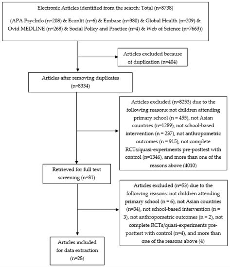 The PRISMA diagram of this review is shown in Figure 1. The search yielded 8738 publications. After excluding the duplicates, the titles and abstracts of 8334 publications were screened and 81 articles were retrieved for full-text screening. In total, 28 articles were included for data extraction. The reasons for exclusion were mainly related to study designs (not complete RCTs/quasi-experiments pre-posttest with control) and target populations (not in Asian countries).