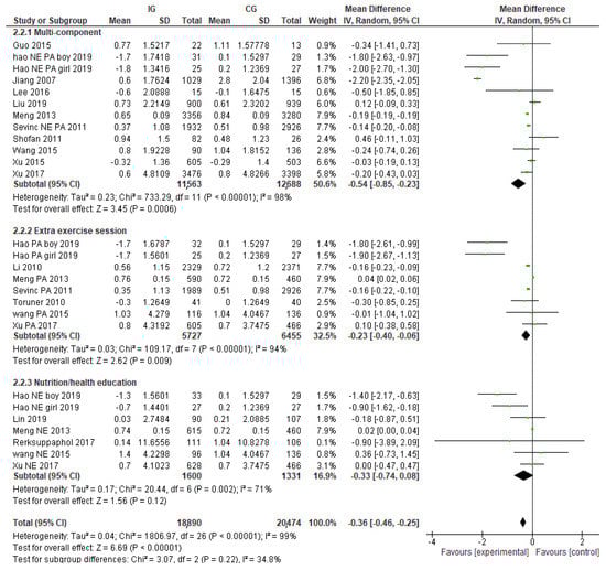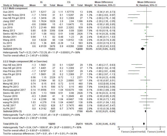 Categorised by the interventions’ component, the multi-component interventions significantly reduced BAZ by −0.07 (95% CI: −0.08, −0.05), while the pooled effect size of single-component interventions was not statistically significant (See Figure 4). No significant difference was found between nutrition education and extra exercise prescription (See Figure 5).