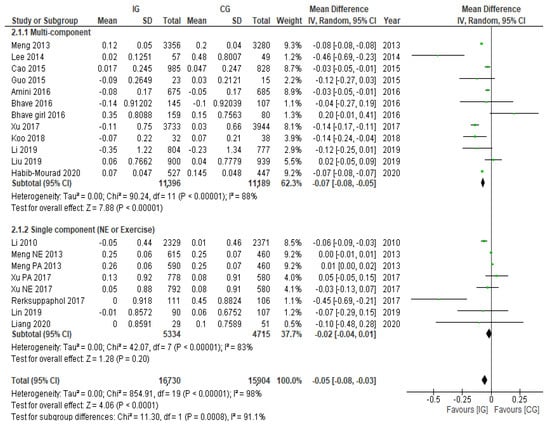 Subgroup analysis for interventions with and without healthy food provision showed that the interventions without healthy food provision group reduced BMI with a reduction of −0.77 kg/m2 (−1.34, −0.19), while the interventions with healthy food provision group did not show a significant reduction. Multi-component interventions were found more frequently in the interventions with healthy food provision than another group (9 out of 9 (100%) versus 12 out of 18 (67%), respectively). Twelve out of 18 interventions without healthy food provision (67%) were overweight/obesity treatment, while none was found in the subgroup of interventions with healthy food provision.