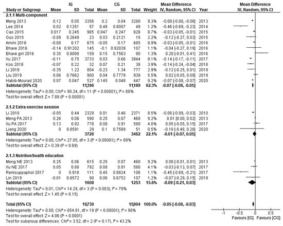 Subgroup analysis was performed according to the following characteristics that were pre-specified in the review protocol: components of interventions (single-component versus multi-component, nutrition education versus extra exercise sessions versus multi-component intervention, and having a healthy food provision (i.e., improved school food environment or food boxes by increasing fruits and vegetables or whole grains, decreasing fat/oil and sugar, and restricting fast food availability in and around schools) versus not having a healthy food provision), duration of intervention (<1 year versus ≥1 year), sample size (<1000 students versus ≥1000 students), and engagement of parents (involved parents versus uninvolved parents).
