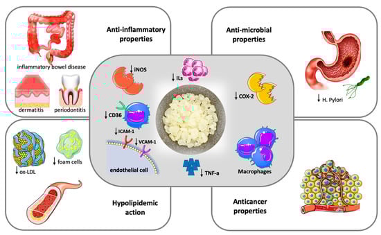 Mastic demonstrates a protective effect on intestinal epithelial cells, largely determined by its anti-inflammatory and antioxidant properties [25]. This action has been more thoroughly investigated in inflammatory bowel diseases, where mastic has been found to decrease the cytokines tumor necrosis factor-a, malonaldehyde, intercellular adhesion molecule-1 (ICAM-1) and interleukin -6, -8 and -10, both in preclinical and clinical studies; thus, efficiently inhibiting intestinal damage [26,27]. In addition, mastiha supplementation promotes a partial but respectable recovery of microbial diversity, acting as a natural probiotic factor [28]. A randomized controlled trial including 148 subjects showed that mastic, at a dose of 350 mg three times daily, significantly improved symptoms related with functional dyspepsia after 3 weeks of treatment [16].