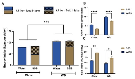 The combined energy intake from fluid and solid food was on average 26% higher (p < 0.001) in the WD groups (115 ± 7.5 kJ/mouse per day for water group and 108 ± 3.0 kJ/mouse per day for the SSB group) compared to chow groups (80.5 ± 0.9 kJ/mouse per day for water group and 84.2 ± 1.2 kJ/mouse per day for the SSB group) but did not differ between SSB and water-fed mice in each group (Figure 1A). The SSB-fed mice consumed less chow (Figure 1B) and more fluid (Figure 1C) in both diet-groups (p < 0.0001). In more detail, the mice consumed on average 2.12 ± 0.22 g/ mouse per day less chow in the chow group, and 2.22 ± 0.27 g/ mouse per day less chow in the WD group when SSB was provided as beverage. In contrast, the fluid intake was higher when mice were provided SSB compared to water, there was an increase by 7.2 ± 0.7 mL/day per mouse in the chow group and by 5.1 ± 0.9 mL/day per mouse in the WD group (p < 0.0001), corresponding to an increase of 37% or 35%, respectively. The mean calories consumed from the soft drink were 36 kJ, or 29 kJ, respectively. Two-way ANOVA confirmed that there was no interaction between fluid intake based on the diet, meaning that the SSB intake did not depend on the type of diet.