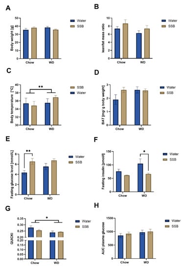 (A) Mean body weight (n = 11–12 for chow group, n = 7–8 for WD group), (B) mean lean/fat mass ratio, (n = 11–12 for chow group, n = 7–8 for WD group), (C) total mass of brown adipose tissue (BAT), (n = 9–12 for chow group, n = 7–8 for WD group), (D) mean body temperature (n = 11–12 for chow group, n = 5–8 for WD group), (E) mean fasting glucose level, (n = 11–12 for chow group, n = 7–8 for WD group), (F) mean fasting plasma insulin concentrations (n = 11–12 for chow group, n = 7–8 for WD group), (G) mean values for quantitative insulin sensitivity check index (QUICKI) (n = 9–11 for chow group, n = 7–8 for WD group), and (H) mean area under the curve (AUC) obtained from glucose concentrations during an oral glucose tolerance test (n = 11–12 for chow group, n = 7–8 for WD group). Data is shown as mean ± SEM, from mice receiving either a standard diet (chow) or Western-type diet (WD) with water (Water, blue bars) or a sugar-sweetened beverage (SSB, brown bars) as a drink for 24 weeks. Statistical significance was tested using two-way ANOVA with the Holm–Sidak post hoc test, except for quantitative insulin sensitivity check index (QUICKI), which was analyzed using the Mann–Whitney U test due to a lack of equal variances. Significance was assumed at p < 0.05. * p < 0.05, ** p < 0.01.