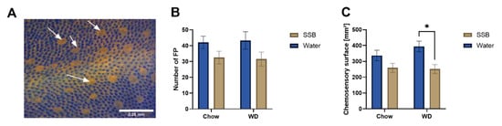 (A) Representative image for the analysis of the fungiform papillae after staining with methylene blue taken at 10× magnification. The light-stained fungiform papillae with the darker taste pore in the middle, exemplarily marked with arrows, can be easily distinguished from the non-gustatory filiform papillae (dark blue stained). (B) Mean number ± SEM of fungiform papillae at the anterior part in front of the intermolar eminence, and (C) mean chemosensory surface ± SEM from the fungiform papillae, calculated from the size and number of the fungiform papillae from mice receiving either a standard diet (chow) or Western-type diet (WD) with water (Water, blue bars) or a sugar-sweetened beverage (SSB, brown bars) as a drink for 24 weeks. Statistical significance was tested using two-way ANOVA with the Holm–Sidak post hoc test from n = 11–12 for the chow group, and n = 7–8 for the WD group, assumed at p < 0.05 and is marked by *.