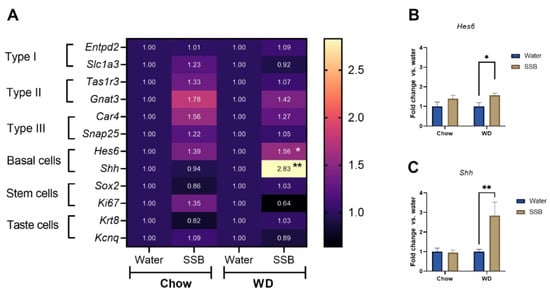qPCR analysis of marker genes for different cell types of the taste bud in the circumvallate papillae (CV) from mice that received either a standard diet (chow) or Western-type diet (WD) with water (Water, blue bars) or a sugar-sweetened beverage (SSB, brown bars) as a drink for 24 weeks. (A) Heatmap representing the mean fold changes to the corresponding water control in a color code. (B,C) Gene expression analysis of Hes6 and Shh. Statistical significance was tested using two-way ANOVA with the Holm–Sidak post hoc test or Student’s t-test, assumed at p < 0.05. * p < 0.05, ** p < 0.01, n = 9–10 for the chow group, n = 7–8 for the WD group.