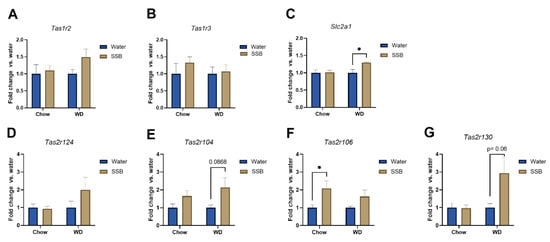 Gene expression analysis with qPCR of (A) Tas1r2, (B) Tas1r3, and (C) Slc2a1, encoding for the glucose transporter one, (D) Tas2r124, (E) Tas2r104, (F) Tas2r106, and (G) Tas2r130. RNA was obtained from the CV of mice that received either a standard diet (chow) or Western-type diet (WD) with water (Water, blue bars) or a sugar-sweetened beverage (SSB, brown bars) as a drink for 24 weeks. Mean fold changes ± SEM in gene expression of the SSB-fed diet groups is displayed in relation to the respective water-fed group (=1). Statistical significance was tested using Student’s t-test or Mann–Whitney U test in case of Tas2r106 and Tas2r130 and assumed at p < 0.05 and is marked by *, n = 9–10 for chow group, n = 7–8 for the WD group.
