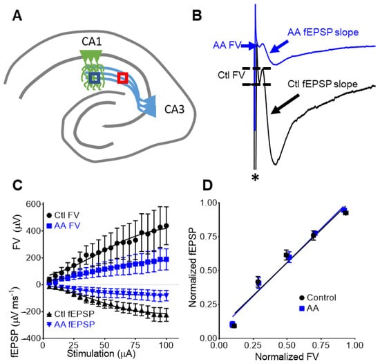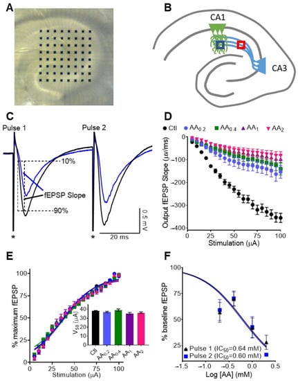 Postnatal day (P) 38–P45 mice were anesthetized, decapitated, brains removed, and horizontal sections (400 μm) of ventral hippocampal-entorhinal cortex were sliced on a vibratome (Leica VT1200, Leica Microsystems Inc., Bannockburn, IL, USA) positioned over a multi-microelectrode array on a MED64 probe (Figure 1A) as we have previously described [16,17,18,19]. One slice per animal was used. Spontaneous and evoked extracellular field recordings were acquired with Med64 Mobius software v3.02 (Alpha Med Scientific Inc., Osaka, Japan). For each slice, the experimental protocol was as follows: Initially, a single biphasic pulse (35 μA, once per minute) stimulated the Schaffer collateral pathway until responses in the CA1 stratum radiatum and stratum pyramidale stabilized for at least 15 min. An input/output (I/O) curve was then generated to determine the intensity of stimulus that elicited 40–60% of the maximum response at. Slopes (10–90%) of field excitatory post-synaptic potential (fEPSP) were used to quantify responses to limit contamination from population spikes and other sources of current within the slice, whereas waveform area was measured to quantify population spikes in the stratum pyramidale. Evoked potentials were then generated by paired pulses (40 ms inter-stimuli interval) every minute. The degree of facilitation was determined by calculating the paired-pulse ratio (PPR), i.e., dividing the second response by the first response. After steady control baseline responses were established for 15 min, spontaneous activity was recorded for five minutes, after which paired pulse stimulations resumed. Slices were then perfused with different concentrations of AA (one concentration per slice) until the effect plateaued (15–20 min). Another I/O curve was generated to determine AA effects on synaptic strength and excitability, and another five minutes of spontaneous activity was recorded. This was followed by LTP induction and additional recording of paired pulse stimulation for 60 min. LTP was induced with a theta burst stimulation (TBS) protocol consisting of eight trains (40 ms duration) of eight pulses at 200 Hz with 2 s intervals between trains and at a stimulus strength of 40–60%) as described by Sheridan et al. [20]. For measurements of control LTP, the same protocol was performed on untreated slices. Thus, slices from 20 mice (4 mice for each AA concentration and control LTP) were used to determine AA effects on neurotransmission, plasticity and network activity.