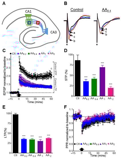 3.5. AA Reduces STP and LTP at the CA3-CA1 Synapse