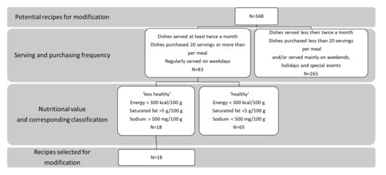 Information on recipe ingredients of lunch menu dishes and the actual serving frequency in the catering services of the intervention group was obtained from the catering service staff. We calculated the dishes’ nutrient content for each recipe using “Tzameret”, Nutrition Analysis Software [20]. Based on this information, we developed an algorithm for choosing recipes to modify during the intervention (Figure 1). The first step of the selection algorithm was based on the weekday serving frequency of the dishes and the number of dishes that were purchased by diners. Namely, we chose dishes that were served at least twice a month on weekdays and purchased on average by more than 20 diners per day. The second step was to determine whether a dish was less healthy or healthy according to the Israeli Ministry of Health recommendations [21]. Specifically, the less healthy dishes were selected for modification, namely, those with energy >300 Kcal per 100 g, or with saturated fat >5 g per 100 g, or with sodium >500 mg per 100 g.