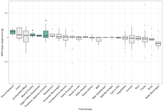 Among all 23 food groups, half presented a mean absolute error between 25% and 50%. “Milk and milk-based beverages”, as well as “Non-alcoholic sweetened beverages” had a mean absolute error below 10%. On the other hand, “Fats & oils”, “Sweeteners” and “Condiments & sauces” showed a mean absolute error over 50%. As depicted in Figure 1, MFR significantly overestimated weight for “Meat & Poultry” (p = 0.0001), “Fish & Seafood” (p = 0.004), “Eggs & meat substitutes” (p = 0.027) and “Potatoes, legumes and Beans” (p = 0.023).