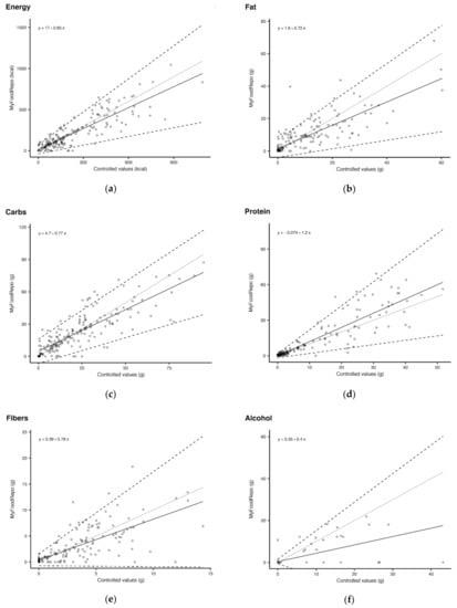 Overall performance for energy and macronutrient content: Linear regression of MFR versus controlled values for all found records, for content of (a) energy; (b) fat; (c) carbohydrates; (d) protein; (e) fiber and (f) alcohol. (Black line: linear regression line; dotted line: 95% limits of agreement; grey line: y = x).