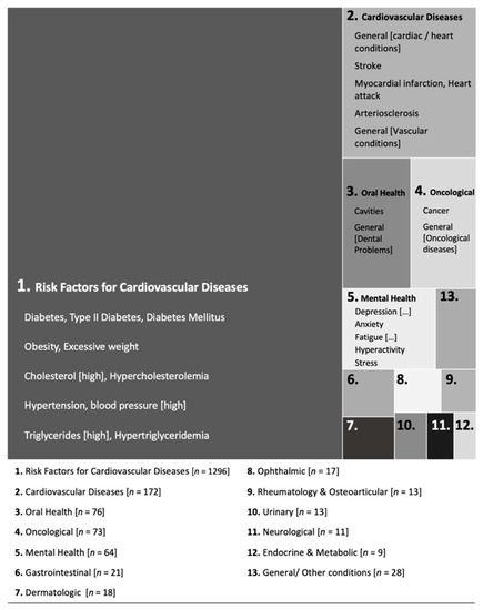 Categories of health conditions associated with excessive sugar intake. Note. The total number of health conditions = 1812. The area of each response category corresponds to its absolute frequency. Examples of health conditions are provided for the five most frequent categories.