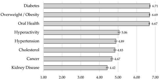 A one-way ANOVA with repeated measures showed that the strength of the association varied according to the health condition, F(5.04, 5089.23) = 582.54, MSE = 1422.98, p < 0.001, ηp2 = 0.366 (with Huynh–Feldt correction as sphericity assumption was not verified). Overall, participants perceived all health conditions to be associated with sugar consumption (M = 5.49, SD = 0.85). As shown in Figure 2, diabetes, overweight/obesity, and oral-health problems were perceived as having the strongest associations with excessive sugar intake (vs. all other health conditions, all p < 0.001; post hoc tests with Bonferroni correction). Kidney disease obtained the lowest association ratings (vs. all other health conditions, all p ≤ 0.001).