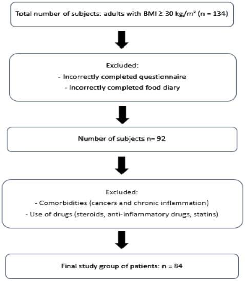 Due to the BIA examination procedure, the project did not involve pregnant women, people with epilepsy, cardiac pacemakers, implants and prostheses. One hundred and thirty-four volunteers with BMI equal to or greater than 30 kg/m2 were examined. The study excluded individuals whose questionnaires and food diaries were incomplete, and those whose disease entities (cancer, autoimmune diseases and chronic inflammation) as well as medications (steroids, anti-inflammatory drugs, statins) could change the level of interleukins. The Figure 1 shows the process of inclusion or exclusion into the study group.