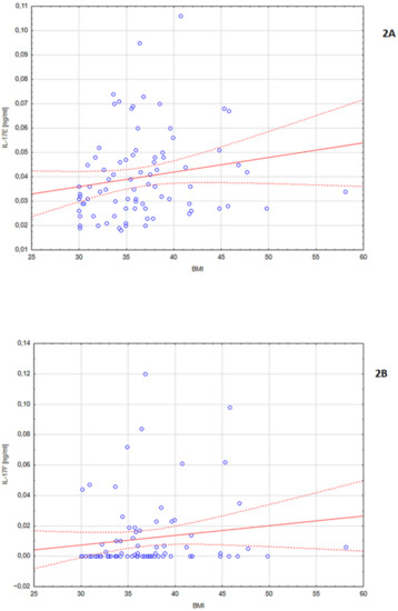 Overweight and obesity are the result of the excessive accumulation of adipose tissue as a consequence of increased energy consumption as food in relation to the body’s energy needs [1]. According to the World Health Organization, in 2016, there were 39.1% over-weight people (body mass index (BMI) ≥ 25 kg/m2) and 13.1% obese (BMI ≥ 30 kg/m2) worldwide in 2016. More accurate data depends largely on the region, e.g., in Europe in 2016 23.3% of people had obesity, and in the Americas, 28.6% [2]. It is estimated that in 2030, over 51% of the world’s population will be obese [3]. Excessive adipose tissue is not only an aesthetic issue, but mainly a health problem contributing to the occurrence of metabolic syndrome and many diseases such as: type 2 diabetes, cardiovascular diseases, cancers and autoimmune diseases [4]. Both animal and human studies have confirmed that these diseases and obesity are linked to low-grade inflammation caused by the infiltration of adipose tissue by immune cells. This is evidenced by the increased level of acute phase proteins and pro-inflammatory mediators in the blood serum of obese individuals [5]. Inflammatory markers such as CRP, IL-6 or TNF-α are the best studied. However, there is little information considering the IL-17 family interleukins in correlation with obesity. These interleukins are produced mainly by Th17 lymphocytes, which are physiologically involved in the neutralization of fungal and bacterial pathogens by activating neutrophils. It turns out, however, that they can also play a key role in the emergence and progression of cancer and chronic inflammatory diseases in which obesity is considered a risk factor [1,6]. The IL-17 family in humans comprises IL-17 6 isoforms from A to F. It has been recently suggested in studies that IL-17A is involved in the induction of low-grade inflammation and adipogenesis, and also affects blood glucose levels [7]. The cytokines of the IL-17 family are released not only by Th-17 lymphocytes, but also by other immune cells, e.g., neutrophils, mast cells and ILCs, which are residing in many tissue. The pleiotropic effect of IL-17 influences neutrophils and macrophages as well as many cells outside the immune system: endothelial cells, fibroblasts, osteoclasts, chondrocytes, osteoblasts and keratinocytes [8]. The other member of this family, IL-17C, is mainly produced by epithelial cells and was recently found to be important in promoting cytokines and anti-microbial peptides production in the gastrointestinal tract [9]. L-17E mediates a positive feedback loop between epithelial and immune cells in the gut mucosa, leading to the augmentation of Th2 response to external cues (commensal flora, infections, etc.) [10].