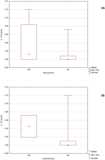 Subjects diagnosed with atherosclerosis (p = 0.04) and taking beta-blockers (p = 0.024) had higher levels of IL-17F (Figure 3).
