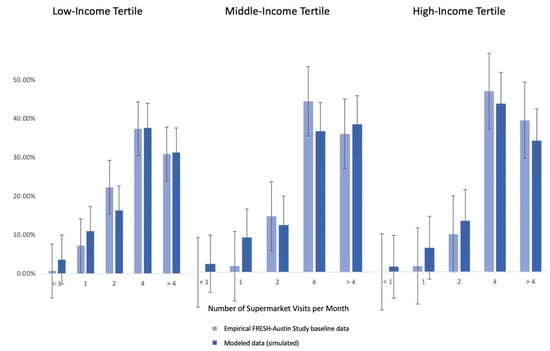 The agent-based model of the business-as-usual (baseline) scenario was found to adequately reflect the patterns observed in our baseline empirical data of the FRESH-Austin Study, as shown by the results of our two model assessment steps. This included calibrating the model against observed data on the frequency of visits to traditional food vending stores (supermarkets) (Figure 2), and on the price elasticity of vegetables among low-, medium- and high-income residents (Figure 3). Figure 2 shows that there was no statistically significant differences in terms of the distribution of visit frequency to supermarkets between our modeled versus real data. Likewise, Figure 3 shows that our model adequately reflects the fact that vegetable purchasing and intake behaviors among low-income residents are more sensitive to changes in the cost of vegetables.