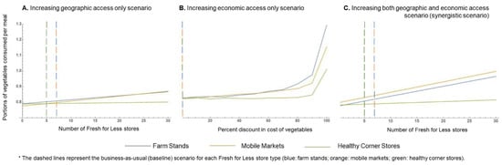 Relative to the business-as-usual scenario (baseline), expanding geographic access from 7 to 30 available mobile markets in low-income areas was expected to yield an extra 0.06 portions of vegetables consumed per meal. This would account to 0.18 added portions of vegetables per day among low-income community members. An equivalent increase in vegetable intake among low-income residents was predicted in the “economic access only” expansion scenario, if all existing mobile markets or farm stands were to offer a 70% discount for vegetables. Under the same policy expansion scenario, it was predicted that if the reduction in the cost of vegetables were to become greater than 85% in any Fresh for Less store type, the gains in extra portions of vegetables consumed per meal would become more meaningful, with greater expected gains occurring due to purchases at farm stands (about 0.15 added portions per meal (0.45 per day) at a 85% discount, and 0.47 added portions per meal (1.41 per day) if vegetables were offered free of cost). Finally, synergistically addressing geographic and economic access could result in a gain of up to 0.16 added portions of vegetables consumed per meal among low-income residents, if 23 new mobile markets were to be placed in low-income neighborhoods, whilst offering a 50% discount on the cost of vegetables. This would account for an extra 0.48 portions of vegetables consumed per day among low-income residents compared to business as usual. Under the same scenario, doubling the number of existing mobile markets at baseline (i.e., going from 7 to 14 mobile markets in low-income neighborhoods) is predicted to result in an extra 0.08 portions of vegetables consumed per meal (an added 0.24 portions of vegetables per day). For all modeled policy expansion scenarios, gains in portions of vegetables consumed per meal due to improved access to healthy corner stores (geographic, economic, or a combination of both) were either minimal or null.
