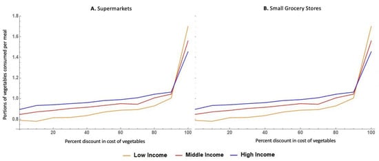 The pattern observed for the relation between the price reduction and the expected number of portions of vegetables consumed per meal was virtually the same across small grocery stores and supermarkets. A 50% discount on the cost of vegetables in either small grocery stores or supermarkets was predicted to yield a 0.06 increase in the portions of vegetables consumed per meal among low-income residents, i.e., 0.18 extra portions of vegetables per day. Reducing the price of vegetables by 90% of its original cost or more was predicted to yield substantially higher increases in vegetable consumption for all income groups. With a 90% discount on the cost of vegetables, an extra 0.21 portions of vegetables were predicted to be consumed per meal among low-income residents, equivalent to 0.63 added portions of vegetables per day. If vegetables were offered free of cost to low-income residents in supermarkets or small grocery stores, our modeling results predict an added 0.91 portions of vegetables to be consumed with every meal among low-income residents (i.e., 2.73 added portions per day).