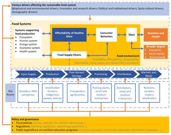 Food policies and governance can influence nutritional outcomes by shaping how food systems function and affect other drivers of food systems. In particular, food and agricultural policies, such as food standards, labeling, and reformulation, are important for food availability, food access, and food affordability. More crucially, governance is essential for implementing food system transformations and ensuring that all stakeholders, particularly smallholder farmers, women, and SMEs, can benefit from improved nutrition through shifting the food environment and influencing biophysical and environmental drivers []. Therefore, in order to establish an ideal food system delivering high-quality food that is both nutritious and affordable for everyone [], integrative solutions are needed across the spectrum; multi-sectoral policies including agricultural trade policies, infrastructure policies, and social protection policies are required to improve nutrition []. The food systems approach has been proved to be productive and efficient in shifting focus towards nutrition in many countries. For instance, a systems approach that considers policy interventions by different sectors is required to improve the access and affordability of healthy diets more effectively, contributing to a better food security and nutrition situation within the population [].