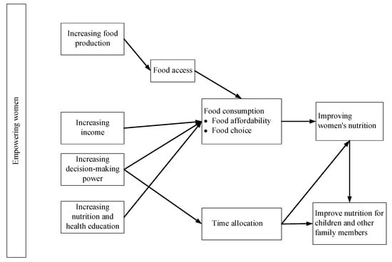 Gender equality and empowerment are critical contributors to good nutrition []. Empowering women is crucial to improve nutrition for families and societies. On the one hand, women are vulnerable groups as they have higher nutritional needs due to physiological requirements, particularly during pregnancy and breastfeeding. On the other hand, empowering women can improve nutrition for other household members, especially their children, as women are often their families’ primary caregivers and food providers. Women play a vital role in children’s growth and health. When women suffer from undernutrition, their offspring are more likely to suffer from malnutrition in their first 1000 days post-conception []. Furthermore, the critical window of “1000 days” regarding developmental damage resulting from undernutrition cannot be reversed and will affect their quality of life for a lifetime [,,]. Empirical evidence shows that empowering women should be the core of all efforts to improve nutrition for mothers, their children, and other household members by strengthening women’s ability to provide food security, health, and nutrition for their families [,]. More than half of the reduction in child stunting from 1970 to 1995 can be attributed to increases in women’s status []. Research further found that empowering women to achieve gender equality would reduce child malnutrition by 13% in South Asia and by 3% in Sub-Saharan Africa []. Additionally, as producers, women play a vital role in improving agricultural output and food supply diversity. In developing countries, smallholder women make up 43% of the agricultural workforce. However, women usually have lower food productivity and food availability, which can be improved by improving their production skills and increasing land ownership. Increased food productivity and food availability among women can further improve their nutrition and health and that of their families []. When women are producers, their impact on nutrition and health is via increased food access, which is similar to that of smallholders, so this is not emphasized in this section.