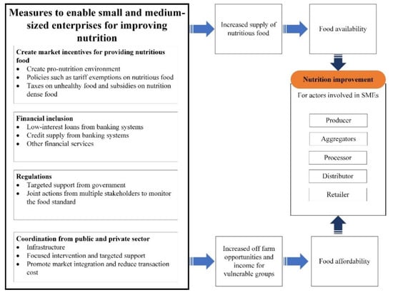 Nevertheless, the supply chain dominated by SMEs is vulnerable and is often neglected. With infrastructure limitations, these systems are poorly integrated, heavily dependent on hired labor, and more vulnerable to disruptions in input supply []. The COVID-19 pandemic introduced an acute shock to businesses worldwide, revealing multiple challenges for SMEs. As one of the important investors in the food system and in line with the goal of maximizing profit, SMEs should be equipped, beyond basic training, to create lasting impacts and inspiration to supply nutritious and safe foods. Existing studies suggest that the following policies and governance can help to improve the food environment and the supply chains through SMEs (as shown in Figure 3).