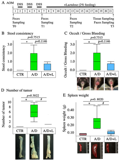 Inhibitory effect of lactulose on the development of AOS/DSS model-related pathology. (A) The experimental protocol for the generation of the AOM/DSS model (A/D) and subsequent treatment with lactulose (A/D+L) is shown. Mice were intraperitoneally injected with azoxymethane (AOM) (12 mg/kg body weight) on day 0. One week later, treatment with dextran sulfate sodium (DSS) was initiated by providing the mice 2% DSS in drinking water for 1 week. The 1-week DSS treatment was repeated 3 times with a 1-week interval. One week after the last treatment with DSS, lactulose treatment was initiated. The mice were fed lactulose-containing chow for 14 weeks. The dose of lactulose was approximately 2 g/kg weight/day. In the AOM/DSS group without lactulose treatment (A/D), the normal chow replaced the lactulose-containing chow. In the control group (CTR), administration of AOM, DSS and lactulose was omitted. Stool samples were collected on day 0 (T0) and 6 weeks (T1), 12 weeks (T2), and 21 weeks (T3) after AOM injection. All evaluations were performed 21 weeks after AOM injection. B–E: Summaries of the score of stool consistency (B), the scores of abnormal/gross bleedings (C), the weight of the spleen (D), and the number of tumors (E). Data are shown in boxplots (n = 8). * p < 0.05 vs. CTR, # p< 0.05 vs. AOM/DSS.