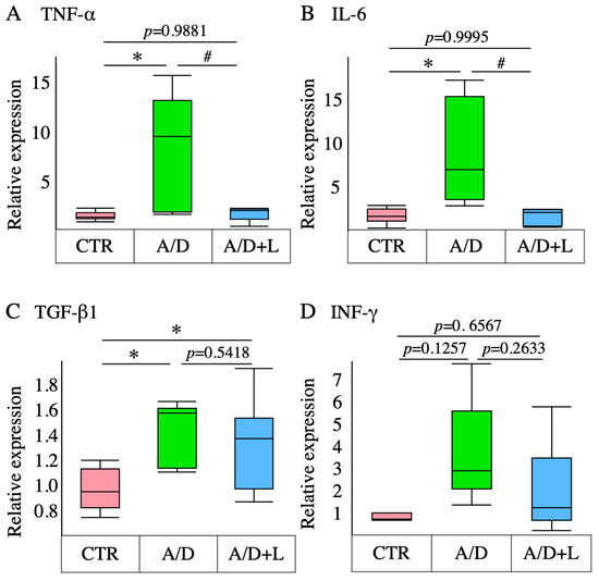 Effects of lactulose on the transcript-level expression of inflammatory cytokines in the AOM/DSS model. The transcript-level expression of tumor necrosis factor α (TNF-α) (A), interleukin 6 (IL-6) (B), transforming growth factor β1 (TGF-β1) (C), and interferon γ (INF-γ) (D) in the control (CTR), AOM/DSS (A/D), and AOM/DSS + lactulose (A/D+L) groups. Data are shown in boxplots (n = 8). * p < 0.05 vs. CTR, # p < 0.05 vs. AOM/DSS.