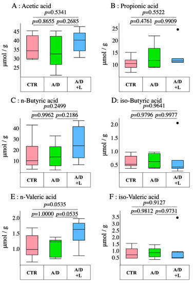 Analysis of short-chain fatty acid levels in the AOM/DSS model. The amounts of acetic acid (A), propionic acid (B), n-butyric acid (C), isobutyric acid (D), n-valeric acid (E), and isovaleric acid (F) in the cecal contents of the control (CTR), AOM/DSS (A/D), and AOM/DSS + lactulose (A/D+L) groups. Circles in the figure (D,F) are outliers, respectively. Data are shown in boxplots. (n = 8).