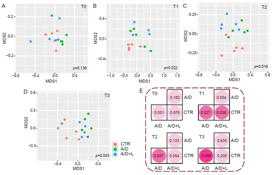 Effect of lactulose on the composition of the fecal microbiota in the AOM/DSS model. The scatter diagrams according to the feature values of MDS1 and MDS2 obtained after dimension reduction are shown for the control (CTR), AOM/DSS (A/D), and AOM/DSS + lactulose (A/D+L) groups (n = 5) at time points, T0 (A), T1 (B), T2 (C), and T3 (D). NMDS analysis based on Bray-Curtis distances revealed the feature values of each sample. The p-values were calculated among three groups (A–D) and between two groups via ANOSIM test (E).