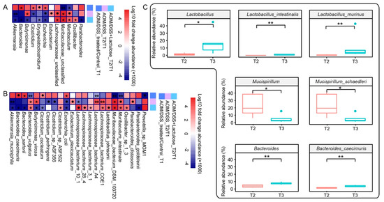 The effect of lactulose on the fecal microbial composition in the AOM/DSS model. (A,B) The heatmaps showing fold-change in the abundance of microbiota (genera in A, species in B) by the comparison indicated in a key: control vs. AOM/DSS at T1, T1 vs. T2 in AOM/DSS and AOM/DSS + lactulose. The differences in microbial composition were calculated by subtraction and significance was calculated using the Wilcoxon test. The values of log10 of the fold change (×1000) were scaled as shown in the key. ● 0.05 < p < 0.06, * p < 0.05, ** p < 0.01 (n = 5). (C) The relative abundance of the indicated genera and species at T2 and T3 in the AOM/DSS + lactulose group. * p <0.05, ** p < 0.01 (n = 5).