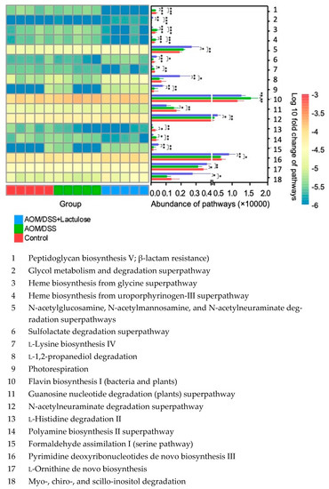 Functional pathways were analyzed to obtain insights into the functional changes in the gut microbiota at different time points. Analysis of the 40 pathways that significantly differed between the control and AOM/DSS-treated groups (AOM/DSS and AOM/DSS + lactulose groups) revealed that the starch degradation III pathway (Table S1, No. 16) and heme biosynthesis pathway (Table S1, No. 2) were significantly upregulated, whereas amino-acid metabolism pathways, such as the L-methionine biosynthesis III pathway (Table S1, No. 27) and the L-threonine biosynthesis superpathway (Table S1, No. 40), were significantly downregulated. Standard deviations are listed in Table S1. Starch degradation and amino acid metabolism are associated with gastrointestinal disorders such as IBD [28], while heme biosynthesis has been shown to contribute to bacterial virulence, promote inflammation, and worsen the prognosis of patients with IBD [29]. With respect to the effect of lactulose (Figure 7), heme biosynthesis (Figure 7, Nos. 3 and 4) and L-histidine degradation (Figure 7, No. 13) were downregulated, while the N-acetylglucosamine and N-acetylmannosamine superpathways and N-acetylneuraminate (Figure 7, No. 5) and L-1,2-propanediol degradation pathways (Figure 7, No. 8) were significantly upregulated after lactulose intake (p < 0.05 in comparison with control and AOM/DSS groups, Figure 7, Tables S2–S4). The genes encoding intermediaries of the 1,2-propanediol metabolism pathway have been reported to be upregulated in Crohn’s disease and shown to be associated with the growth of pathogens in the gut [30]. These results indicate that AOM/DSS significantly affected the composition and functional pathways of gut microbiota, while lactulose improved the relative abundance and functional pathways of the microbiome, phenomena that may be related to relief from AOM/DSS-induced symptoms.