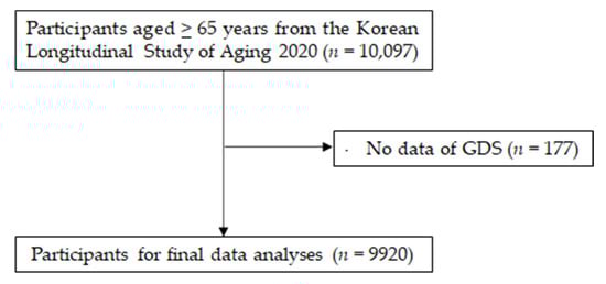 Data were obtained from the 2020 Korea Longitudinal Study on Aging (KLoSA), a nationwide-population-based survey of 6062 women and 4035 men aged ≥ 65 years conducted in Korea. As shown in Figure 1, those without Geriatric Depression Scale (GDS) data were excluded (n = 177). The remaining 9920 samples (including 3971 men and 5949 women) were used for the final data analyses. The Institutional Review Board of the Korea Institute for Health and Social Affairs reviewed and approved the 2020 KLoSA (approval no. 2020-36/approved on 24 March 2020) in accordance with the Declaration of Helsinki. Signed informed consent was obtained from all participants. KLoSA data collection was carried out during face-to-face interviews via a computer-assisted personal interviewing protocol using a tablet. A detailed KLoSA information is accessible via the national public database (https://survey.keis.or.kr/eng/myinfo/login.jsp/ accessed 10 June 2021).