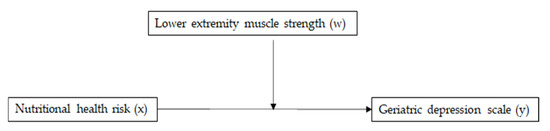 A conceptual diagram for the relationship between nutritional health risk (x) and Geriatric Depression Scale (y) moderated by lower extremity muscle strength (w).