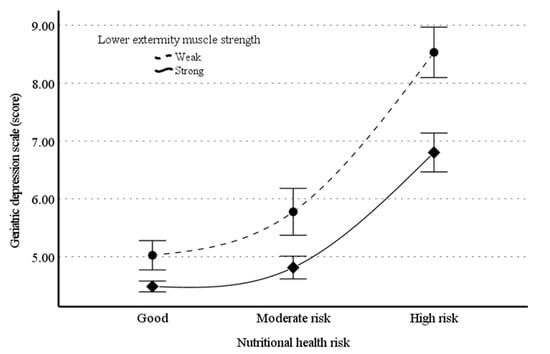 Third, other health conditions, such as chronic diseases, increased oxidative stress, immobility, and dysregulated hormonal cycles, which are attributed to nutritional health risk and/or weak muscle strength, might be involved in the moderating effect of lower-extremity muscle strength on the relationship between nutritional health risk and depression [49,54].