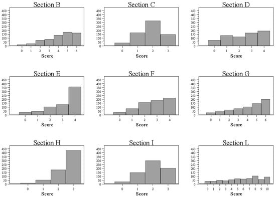 Sections’ scores were then computed by summing up the scores of each section’s items. A summative score for each factor was justified by the substantial homogeneity of scores in the MCAs of the factors. In all sections, the scores covered the entire range of theoretically possible values, were characterized by asymmetrical distributions and showed relevant variability (Figure 1).