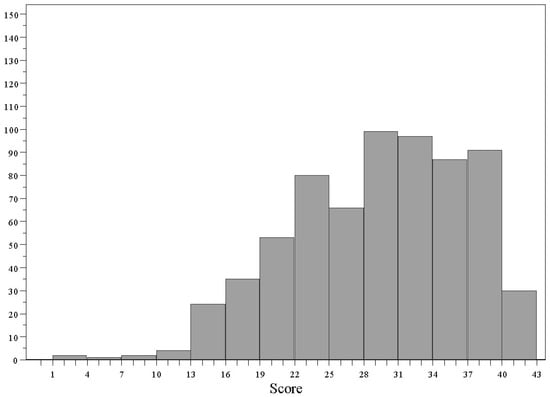 The construction of a total FKQ score was then explored. Such a summative score ranged from 1 to 43 (its theoretical maximum value), with a median value of 30 (IQR 11). The value at the 75th percentile was 35. The distribution of the total FKQ score is represented in Figure 2.