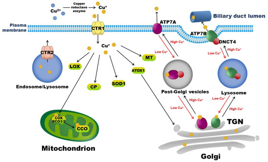 Copper exists in two ionic forms in the body, namely, cuprous Cu+, which is dominant in the intracellular reductive environment, and cupric Cu2+, which is dominant in the extracellular oxidative environment. In mammals, copper is exclusively absorbed from diets and water by enterocytes in the small intestine via the Cu+-specific copper transporter 1 (CTR1). The reduction of Cu2+ to Cu+ is necessary for its entry into cells and is mediated by copper reductases, including members of the plasma membrane-bound six transmembrane epithelial antigen of the prostate (STEAP) family [2]. The latest study by Kurdistani et al. identified a novel copper reductase enzyme, the histone H3-H4 tetramer, which binds to Cu2+ and catalyzes its reduction to Cu+ in Saccharomyces cerevisiae yeast to maintain the function of the electron transport chain in mitochondria [3]. After entering interstitial fluid, copper initially binds to albumin or transcuprein, travels through the portal circulation, and is taken up by the liver via hepatic CTR1. Copper in the liver is then incorporated into CP, a major plasma copper-binding protein responsible for carrying >90% of copper in the circulation [4]. Copper-loaded CP delivers copper to extra-hepatic tissues, and excess copper returns to the liver for excretion into bile through hepatic copper-transporting ATPase 2 (ATP7B). Intracellular copper transportation and involved copper-binding proteins and chaperons are depicted in Figure 1.