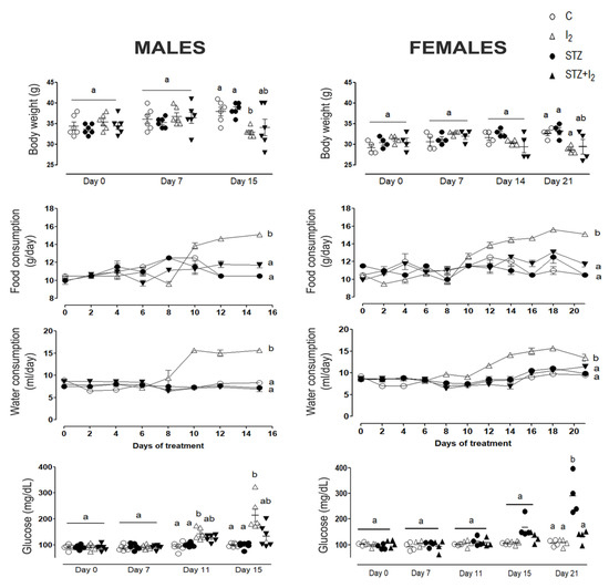 Body weight change, food and water consumption and glucose levels in male and female rats. Results are expressed as mean ± SEM. Different letters indicate statistical differences between groups (one-way ANOVA, Tukey’s test; p < 0.05).