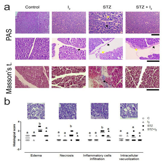 Histological characteristics of pancreatic acinus: (a) micrographs showing the presence of proteoglycans (black arrows, in Periodic Acid-Schiff stain), edema (black arrows, in PAS stain) and inflammatory cell infiltration (yellow arrows, in PAS stain) and collagen (black arrows in Masson’s trichrome). Scale: PAS stain 100 µm (first row); and 20 µm (second row); Masson’s t. 20 µm; and (b) representative micrographs of pancreas damage (20 µm) and quantitative analysis of the histological score. Data are expressed as the mean ± SEM, and different letters indicate a statistical difference between groups (one-way ANOVA, Tukey’s test; p < 0.05).