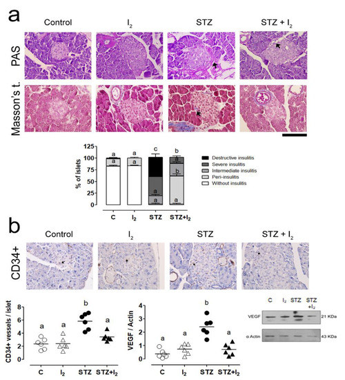 The integrative analysis of insulitis is summarized in Figure 3. PAS and Masson´s stain show inflammation and necrotic areas. It is evident that STZ generated severe damage in islets marked by 45% of destructive and 30% of intermediate insulitis. Vascularization (CD34+ cells) was increased around the islets associated with an increase in VEGF expression. The iodine supplement exhibited significant protection showing mainly peri-insulitis (60%) and intermediate or severe conditions only in 15% and 10% of islets. The I2 supplement also prevented the vessel increase and VEGF induction.