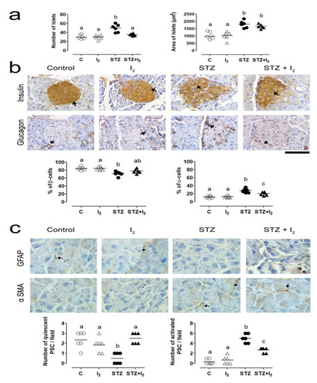 Cellular analysis showed that STZ administration modified the presence and functionality of β- (insulin) and α- (glucagon) cells (Figure 4). STZ promoted a decrease in β-cell density and an increase in α-cell density in islets, suggesting an early diabetogenic effect (Figure 4a). GFAP and α-SMA immunohistochemistry were used to evaluate the quiescent or activated PSCs, respectively (Figure 4b). Quiescent PSCs decreased, whereas activated PSCs increased in the pancreas of STZ animals. The I2 supplement prevented changes in cell proportion and showed a partial but significant protection against PSC activation.